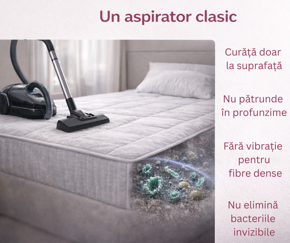 În fiecare noapte dormi pe o suprafață care acumulează în timp praf, celule moarte, păr, alergeni și particule microscopice invizibile. Problema? Aspiratorul obișnuit nu este conceput pentru a curăța în profunzimea textilelor dense precum saltelele, pernele sau canapelele. Acest aspirator special pentru textile este creat exact pentru asta.